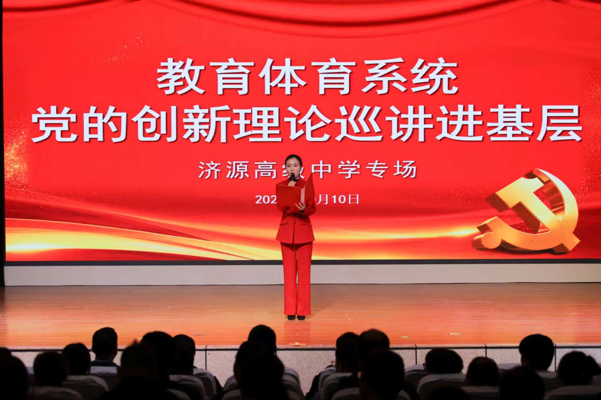 10月10日,济源高级中学在报告厅开展济源教育体育系统党的创新理论巡讲进基层专场活动,600余名学生和党员教师现场聆听,共同感受理论与实践交融的思想洗礼。示范区教育体育局党建办副主任丁武周、干部崔聪聪,济源高级中学校党政领导班子全体参加活动。