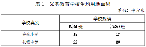 第九条 学校占地面积应满足与其办学规模相适应的建筑用地、体育用地、绿化用地、道路及广场、停车场等用地的需要。有条件时宜预留发展用地。应根据实际情况和生源变化趋势,按照科学合理、节约用地、资源共享的原则进行规划、建设。结合城市规划,在学校主出入口外应设置人员集散场地。义务教育学校生均用地面积见表1。