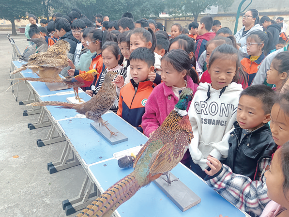 林麝、游隼、红腹锦鸡……活动现场,一批造型优美、神态逼真的野生动物标本吸引了学生。大家近距离观察猛禽的羽翼、兽类的毛发等细节特征,直观感受野生动物的形态之美。工作人员从野生动物的概念、种类、习性等方面进行讲解,用通俗易懂的语言普及野生动物保护知识,穿插真实案例,让生态科普变得更生动、有趣。