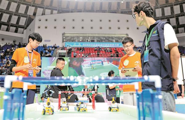 10月3日,在济源举行的全国青少年科技体育大赛上,参赛选手在进行机器人足球比赛。