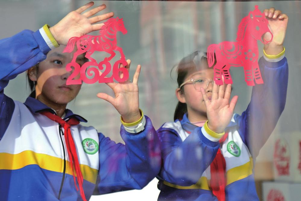 2月4日,北海街道健康路小学学生在张贴剪纸作品,营造喜庆的节日氛围。