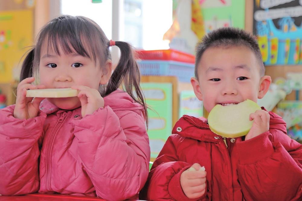 2月4日,立春节气,北海街道健康路幼儿园的小朋友吃萝卜“咬春”,在民俗活动中体验传统文化的魅力。