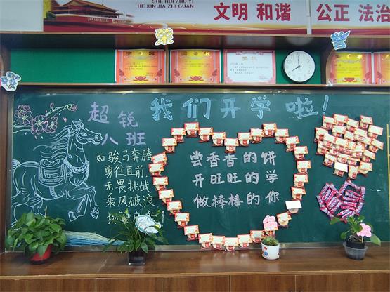 教室里,同学们还以“我们开学啦”为主题,用自己的匠心巧手创作出一板板精美的黑板报。这些黑板报形式多样,图文并茂,如精美的书签构图、绚丽的贺卡组合、巧妙的“心形”点缀等,书写着全班同学对于新学期的梦想与誓言。济水校区八(8)班同学还头戴“骐骥”发箍,手捧“拉花”书袋,发愿要在新学期以梦为马,不负韶华……同学们以此向“开学第一课”献礼,向新学期宣战。