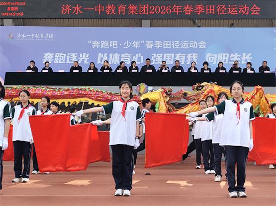 4月2日,济水一中举行了2026年“奔跑吧·少年”春季田径运动会开幕式。上午8时,学校运动场上红幅横悬,师生云集。仪式开始后,济水一中校旗方阵、标语方阵依次入场,标语方阵用标语“以体育人、以体育心”昭示了此次运动会的育人宗旨。