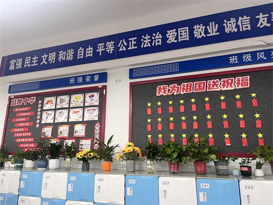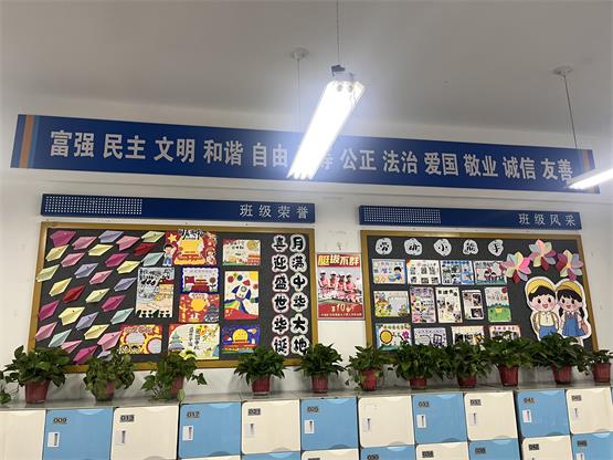 主题环创展风采,班风班貌共提升。围绕“十一”国庆主题,各班师生共同策划、精心布置教室环境。黑板报、文化墙等区域充分展现国庆氛围与劳动实践成果,“十一劳动教育实践周”的优秀作品得以集中展示。这一过程不仅美化了教室环境,更在集体创作中增强了班级凝聚力,展现出积极向上、团结协作的优良班风。