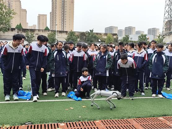 同时,为了帮助学生了解国家在航空航天、人工智能等科技领域的前沿进展,学校还组织同学们观看了航模、无人机、机器人表演。机器狗在操作员遥控下,绕着观众巡行,时而前腿上扑,时而向众招手,惹得全场惊呼频频……