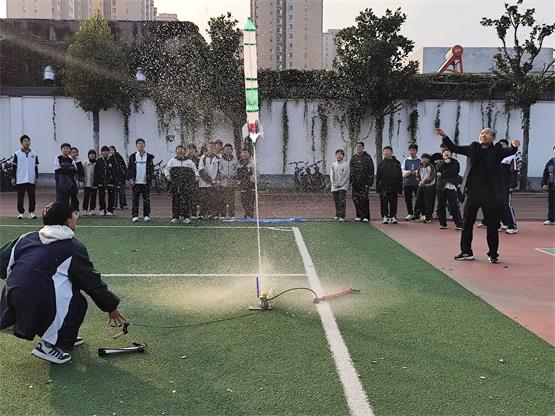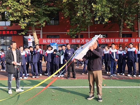 当日下午,学校广场上红幅横悬,各类科技作品分区布展,分别为“科幻画”展区、“科学影像”展区、“科技实践活动竞赛作品”展区、“青少年科技创新成果竞赛作品”展区等,所展作品均为本校学生所创,如抛石机、水火箭、纸桥承重、新能源小车、自制无人机等。师生们涌满各个展区,“学生发明家”对自己所创作品进行解说、演示:科幻画“星海拾遗”迸射着奇瑰奔放的科学想象力;科学影像“探秘之旅”展示了科学探索的伟大、艰辛;“丁烷泡沫”遇火燃烧,揭示了魔术“火焰掌”的奥秘;“水火箭”充气凌霄,诠释了“动量守恒定律”的实际应用……同学们一边聆听,一边参观,不时失声赞叹……