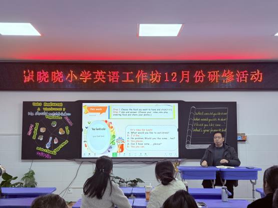 活动首先由玉川路小学翟璐雨老师执教新版五年级上册英语听说示范课 Unit 5 Food we eat A What do we eat?,翟老师通过创设真实情境引导学生互动,呈现了高效课堂范例。随后,周会芳老师从教学目标、内容整合、活动设计等方面,对本单元进行整体教学解读。