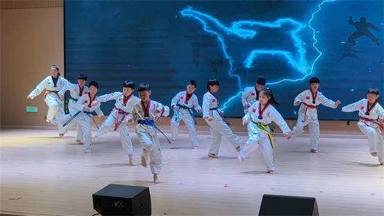 展演环节精彩纷呈,充分展现了学校多元化、特色化的美育路径。体操《快乐跳跳跳》灵动活泼,尤克里里弹奏《月亮翻过小山坡》清新悠扬,舞蹈《云波里·锦鲤跃》飘逸梦幻,尽显艺术之柔美。跆拳道《追风少年》刚劲有力,武术《武动少年》虎虎生威,太极《太极神韵》刚柔并济,彰显传统体育之精神。花样跳绳活力四射,街舞《自由节拍》动感时尚,朗诵《我们的征途是星辰大海》声情并茂,合唱《红领巾爱祖国》《外婆的澎湖湾》温暖真挚……十四个节目轮番登场,或静或动,或古或今,描绘出一幅“五育并举、多元融合”的生动画卷。