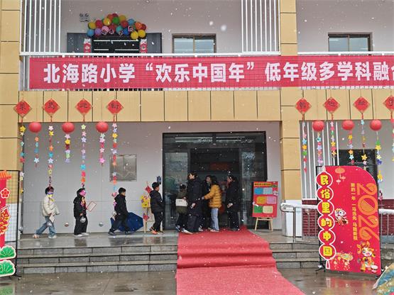 1月30日,北海路小学校园里年意融融,一二年级“欢乐中国年——年俗里的中国”多学科融合场景测评正有序进行。孩子们在年俗创意馆、妙语生花馆、智趣探秘馆等五大情境场馆中动手制作面点、讲述年俗故事、查阅资料、辨别方位,在真实体验与协作探究中综合运用所学知识,完成一项项贴近生活的实践任务。