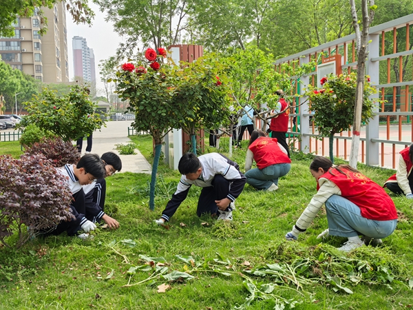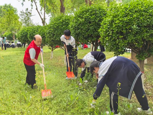4月14日大课间,济源市沁园中学孔子文化园内,沁园中学第一党支部党员和部分团员代表身穿红马甲,一个个蹲在草坪内,拔除杂草、清理杂物,形成了校园内一道亮丽的风景线。这正是沁园中学党总支着力打造“主题党日+”新样态,结合4月主题党日活动,而开展的“主题党日+实践教育”活动的一个缩影。