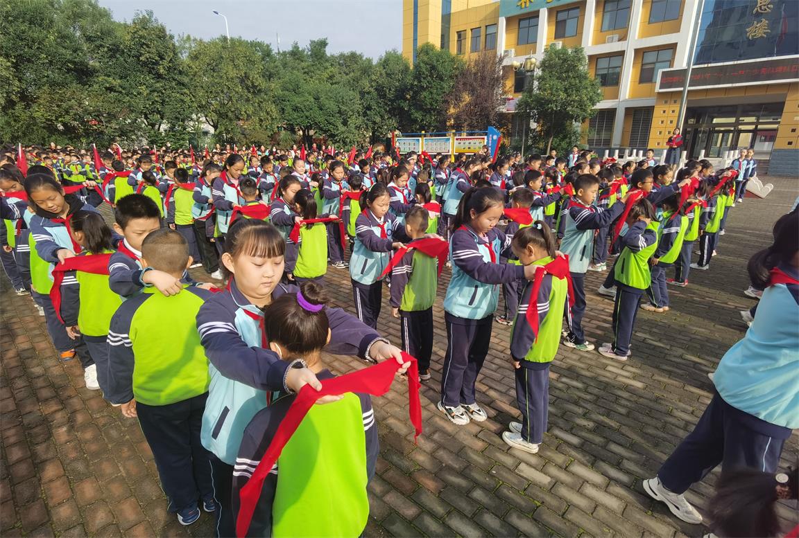环节一:举行新队员入队仪式。学校共有151名新少先队队员光荣加入中国少年先锋队,仪式上,2.5班张灵犀同学代表全体新队员郑重承诺:我们会以少先队员的标准来严格要求自己,争做一名爱党爱国、热爱学习、关心集体、团结同学的好孩子,向老队员学习,用自己的行动让红领巾更红,让队旗更亮,为学校争光、为队旗增辉。