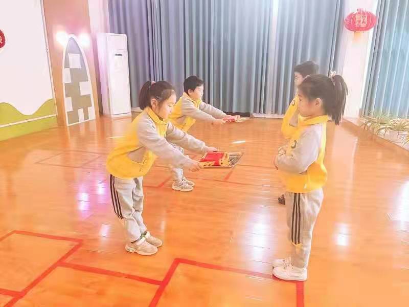 3月7日早上,从梨林中心幼儿园多功能报告厅里传来悠扬的乐曲,漫步厅内,只见台上两排穿着校服的孩子,两两相对站立,然后彼此躬身施礼,两手向前平举,似乎在传递着什么。