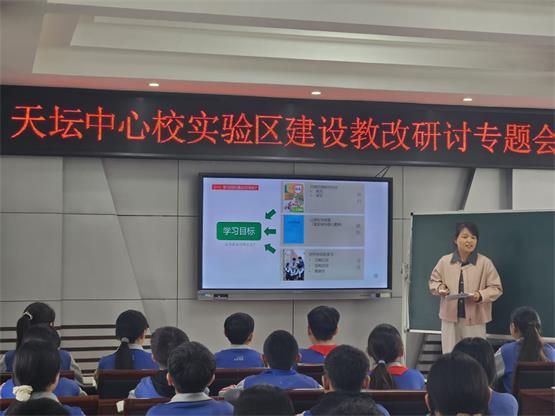 为破解课堂教学改革关键难题,10月15日下午,天坛中心校实验区建设教改研讨专题会在天坛实验小学举行。济源示范区教育工委副书记王飞、教体局相关科室负责人,天坛中心校领导班子成员及辖区内60余名语文骨干教师齐聚一堂,围绕“单元整体教学实施路径”与“教—学—评一致性落地策略”两大核心议题,展开了一场兼具理论高度与实践深度的学术研讨。