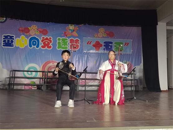 首先,学校副书记卢瑞星发表了热情洋溢的新年致词,接着,成果展在欢快、喜庆的舞蹈《中华全家福》中拉开帷幕,一个个精彩纷呈的节目轮番上演。三年级学生王诚益的毛主席诗词朗诵精神饱满、声情并茂,时而抑扬顿挫,时而慷慨激昂,用稚嫩却坚定的声音诠释着经典篇章中的家国情怀。舞蹈表演环节堪称整场成果展的“成长缩影”,低年级与高年级学生的演绎各有千秋、相映成趣。低年级小朋友带来的舞蹈《蹦吧蹦吧》等充满童真童趣,高年级学生的舞蹈则展现出截然不同的成熟质感,在音乐教师郭晶晶的带动下,将现代舞的张力、集体舞的默契在舞台完美绽放。二胡演奏《我的祖国》,成为整场展演的亮点。学校教师葛亚娟与儿子携手登台,醇厚的旋律缓缓流淌,既展现了中华民乐的独特魅力,又传递出对祖国山河的热爱与赞美,家国情怀在音符中悄然升华。手势舞表演则将现场气氛推向高潮。孩子们整齐划一的手势舞,高亢激昂的口号,让整个餐厅都沸腾起来。