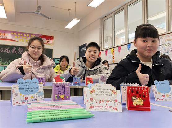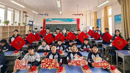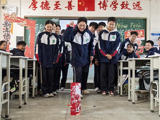 少年向阳而生,策马奔赴新程。七年级作为校园新生力量,在趣味与温情中开启成长新篇章。走进13班,仪式感拉满,家委会精心准备了一米多高的开学季立牌,成为校园里一道亮眼的风景。语文和英语两位老师亲手为每位学生送上马年专属挂饰,并送上暖心祝福。教室里还设置了蒙眼抽盲盒环节,定制祝福袋包装的旺旺雪饼满载“旺气”,让同学们在惊喜中收获满满好运,整个班级暖意融融、喜气洋洋。15班为每位同学准备了姓名定制笔与专属小台历,老师用刻有励志语的定制笔点名,台历寓意珍惜时光、步步为营,同学们认真写下新学期心愿,将理想藏于笔尖。20班在班主任郑利行的带领下,跳起活力满满的快乐小马手势舞,彩色小马气球装点教室,同学们争相合影,笑容灿烂。郑利行老师表示,希望孩子们带着如小马般的朝气与活力,在新学期快乐成长、勇敢追梦,一步一个脚印踏实前行。