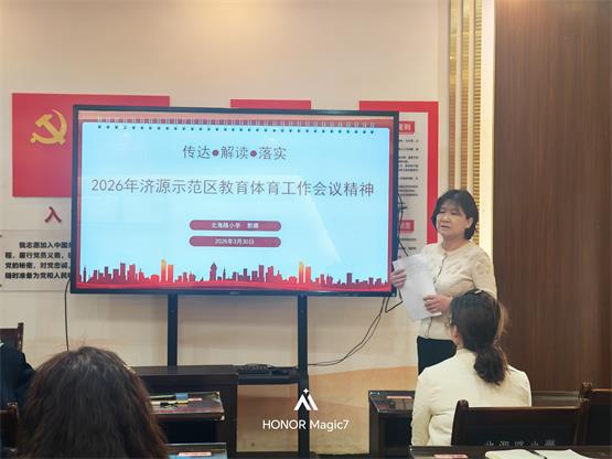 3月30日,北海路小学组织班子成员、年级主任、学科组长等人员,开展2026年济源示范区教育体育工作会议精神专题学习活动。活动以会议精神为主题,以传达、解读、落实为活动主线,采用学习与交流讨论相结合的方式,紧扣学校实际查摆问题、明确举措,推动教体工作会议精神在学校落地生根。